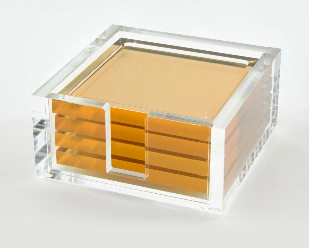 Clear Lucite Holder with 4 Gold Lucite Coasters