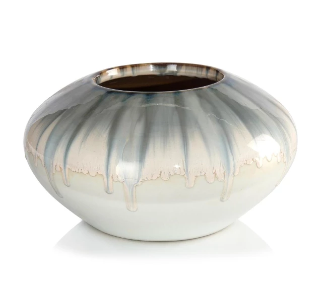 The dreamy blues of this reactive glaze spill from the top edge of the beautiful vase. Disclaimer: Due to glazing process, variations in pattern and color will occur. No two will be identical.