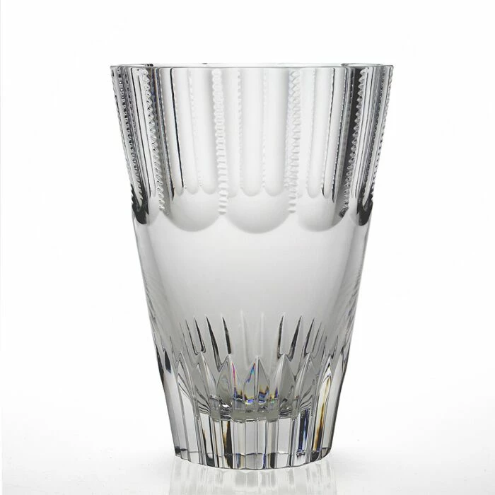 This is a perfect flower vase available in two sensible sizes – 7″ and 10″. Beautifully handmade with flat cuts and delicate notches running to the top of the vase. A stunning piece of classical yet contemporary crystal making.